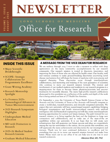 We are excited to share the latest issue of the LSOM Office for Research Newsletter, which highlights the achievements and high-impact discoveries by our research community. With our integration with the University of Texas at San Antonio, we look forward to exciting new opportunities for collaborations and innovation.